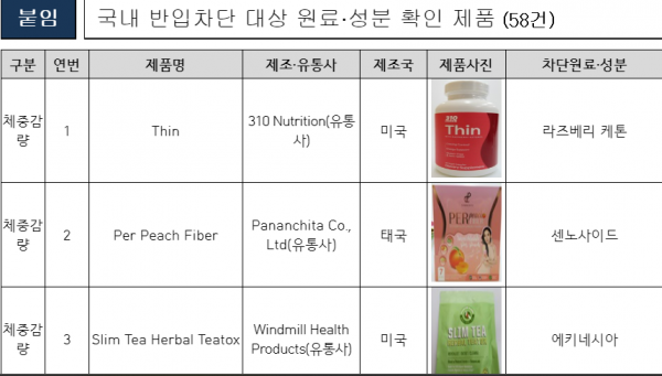 ‘페닐에틸아민’은 향정신성의약품인 암페타민과 유사하며 심박수 증가, 불안, 환각, 메스꺼움, 현기증, 두통 등 부작용을 발생시킬 우려가 있으며, ‘센노사이드’는 변비 치료에 사용되는 의약품 성분으로 체지방 분해‧감소 등 효능은 없으며 다량 섭취하면 설사, 복통, 구토 등 증상을 유발한다.