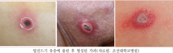 물린 자리에 가피(검은 딱지, eschar)가 생기는 것이 특징이며, 치명률은 국내에서 약 0.1~0.3%로 높지 않으나, 증상의 강도는 높은 것으로 알려져 있다.