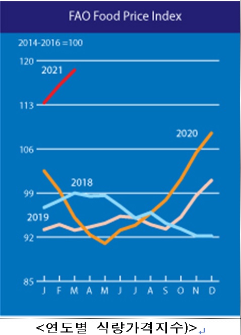 [오행생식 송새눈 기자] 국제연합식량농업기구(FAO)에 따르면, 2021년 3월 세계식량가격지수는 전월 대비 2.1% 상승한 118.5포인트를 기록하였다.